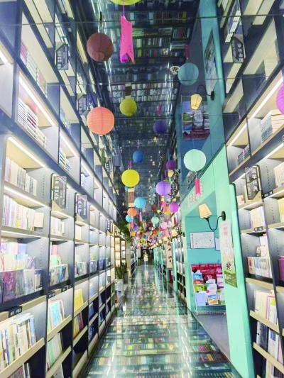 蓝月亮书店坐落在綦江城区一条商业街的负一楼。步入书店,一条36米长的“时光长廊”神秘又悠长呈现在眼前,在地面玻璃和天花板镜面的折射中,书籍五彩斑斓的影子让人仿佛置身梦幻的书海。“时光长廊”的两侧,可以品咖啡、购文创、做手作、阅读分享,让文化融入生活,在品尝精神食粮的同时也能品味人间烟火气。
