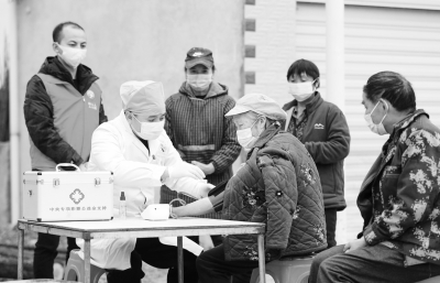 12月27日,在岑巩县思旸镇坪坝村,村医为村民检查身体。 连日来,贵州省黔东南苗族侗族自治州岑巩县成立由村医和党员志愿者联合组成的流动服务队,筹集一些药品,走村串户免费为村里的老年人提供巡诊、送药上门等服务,守护山村老年人健康。