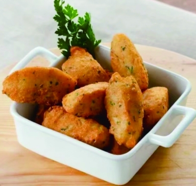 葡萄牙人声称有365种方法来烹调咸鳕鱼,足以证明鳕鱼在葡萄牙美食中的地位。葡萄牙有一道著名的小吃炸鳕鱼球,是将鳕鱼肉和土豆泥混合,炸成橄榄球状的丸子,外酥里嫩,有着蓬松轻盈的口感。除了馅儿料比例和调味略有不同,这道小吃几乎可以在葡萄牙的每家餐馆、酒馆,甚至咖啡馆的菜单上看到。