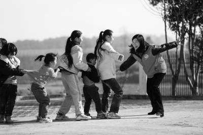1月8日,在贵州省黔西市雨朵镇易地扶贫搬迁点农家书屋外的院坝里,巾帼志愿者和孩子们一起做老鹰捉小鸡的游戏。去年以来,黔西市雨朵镇妇联推出“菜单式”文化服务,通过“群众点单、妇联派单、志愿者接单”模式,组建巾帼志愿者服务队伍,每到寒暑假接单到村(社区)上公益文化兴趣课,为留守儿童提供丰富的文化活动,让他们愉快地度过假期。中国妇女报全媒体记者高峰/文 周训超/摄