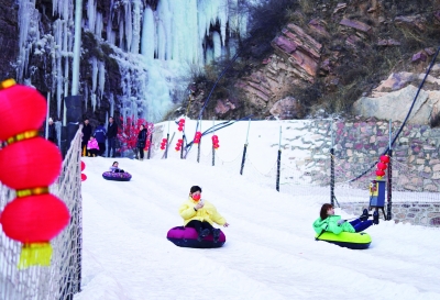 1月9日,游客在邢台天河山景区体验雪圈。 时值腊月,河北省邢台市西部太行山区出现冰瀑景观。当地景区利用自然资源,推出冰瀑游、冰雪乐园等冬季旅游项目,吸引游客前来体验冰雪乐趣。 新华社发(田晓丽/摄)