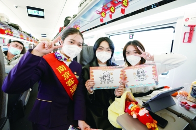 1月11日,在D376次列车上,旅客手拿画作和列车员张文静合影留念。当日,中国铁路上海局集团有限公司南京客运段高铁二车队在D376次列车上开展“回家路上的笑容”绘画活动,列车员现场为旅客作画,送上新年祝福。新华社记者 季春鹏/摄