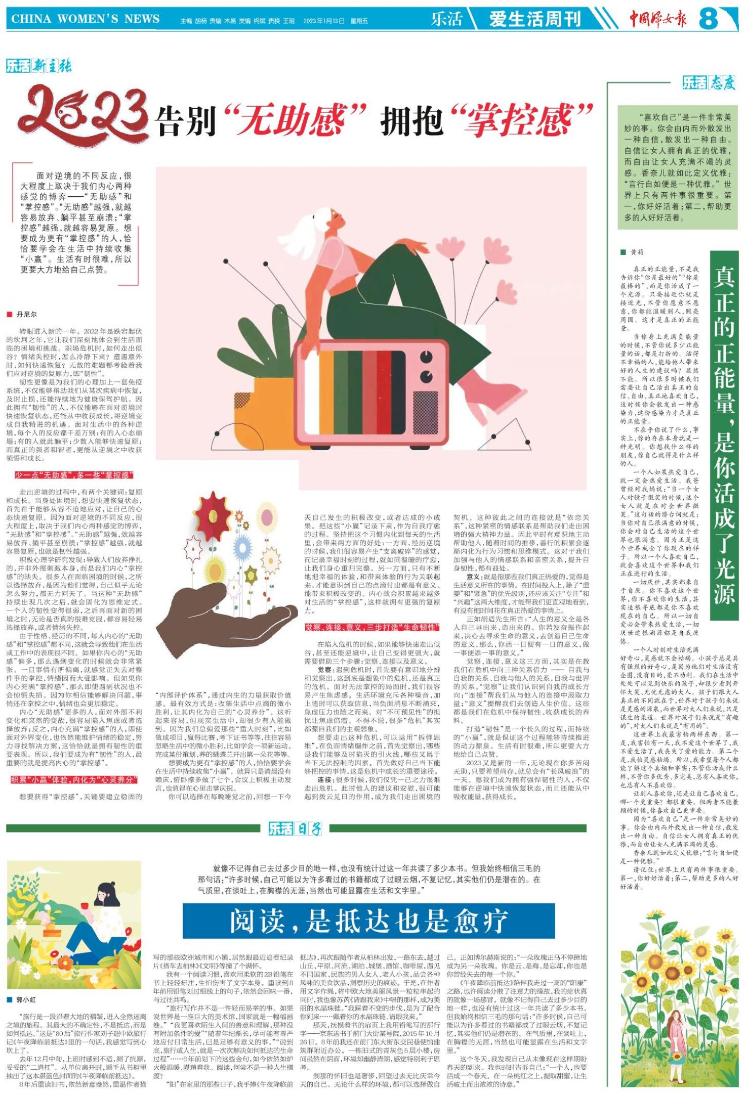 面对逆境的不同反应,很大程度上取决于我们内心两种感觉的博弈——“无助感”和“掌控感”。“无助感”越强,就越容易放弃、躺平甚至崩溃;“掌控感”越强,就越容易复原。想要成为更有“掌控感”的人,恰恰要学会在生活中持续收集“小赢”。生活有时很难,所以更要大方地给自己点赞。