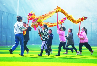 1月12日,大学生志愿者(左一)在贵州省黔西市文峰街道塔山社区易地搬迁点,带领孩子们练习舞龙技艺。春节临近,黔西市文峰街道妇联组织社区干部、大学生志愿者、社会专业人士帮助易地搬迁点孩子们学习窗花剪纸、舞龙、年糕制作等非遗文化,让孩子们感受浓浓的年味。