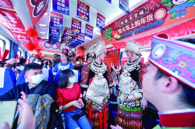 1月10日,旅客在5640次列车新春年货铺观看演出。    5640/39次列车是一趟穿行在贵州少数民族地区、逢站必停的“慢火车”。列车线路始达的两端,一端是贵州省会贵阳,一端是贵州省铜仁市玉屏侗族自治县,途经黔东南苗族侗族自治州多个乡镇,337公里的里程串联起沿途100多个少数民族村寨。    2019年以来,中国铁路成都局集团有限公司贵阳客运段上海二队为方便沿途少数民族地区群众置办年货,决定在这趟列车上开设新春年货铺,平价销售年货。绿皮火车穿行苗乡侗寨山水间,琳琅满目的年货放置在车厢两侧,火红的中国结、红灯笼高挂车厢两旁,与车窗上的春联、福字相互衬托,洋溢着浓浓的中国年味。    新华社记者 杨文斌/摄