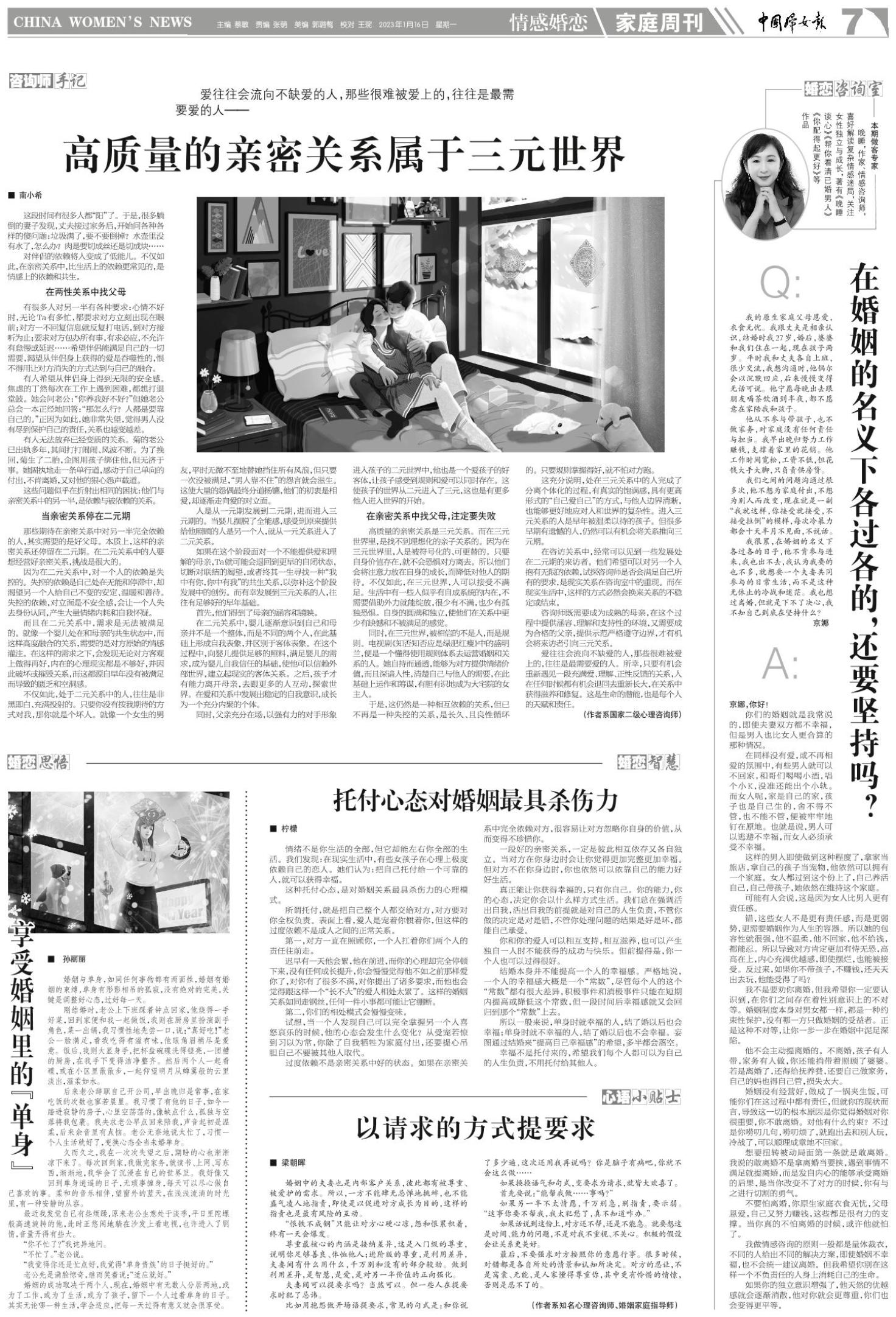 《中国妇女报》(电子版)的一切内容(包括但不限于文字、图片、PDF、图表、标志、标识、商标、版面设计、专栏目录与名称、内容分类标准以及为读者提供的任何信息)仅供中国妇女报读者阅读、学习研究使用,未经中国妇女报及/或相关权利人书面授权,任何单位及个人不得将《中国妇女报》(电子版)所登载、发布的内容用于商业性目的,包括但不限于转载、复制、发行、制作光盘、数据库、触摸展示等行为方式,或将之在非本站所属的服务器上作镜像。否则,中国妇女报将采取包括但不限于网上公示、向有关部门举报、诉讼等一切合法手段,追究侵权者的法律责任。