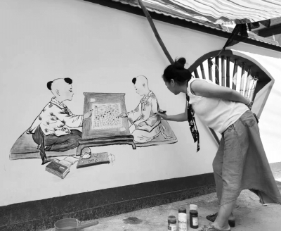 邱平辉正在组织书画分会的会员们努力在乡村做墙绘。“目前一起画了二十几幅,有山水画,有人物画,也有生活场景画,画了近千平方米了。”
