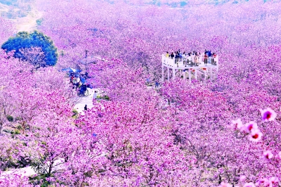 1月29日,游客在江门市新会区大泽镇山头坪游玩赏花。 近日,广东省江门市新会区大泽镇山头坪大面积紫花风铃迎春绽放。