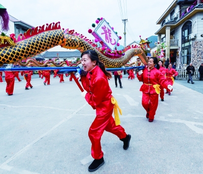 2月1日,窈口村女子板龙队在湖源乡进行板龙舞龙表演。    当日是农历正月十一,在梅花锣鼓的伴奏下,浙江省杭州市富阳区湖源乡窈口村女子板龙队举起由50余张板凳连起来的百米板龙舞动起来,拉开了湖源乡新春系列迎元宵活动的序幕。新华社记者 徐昱/摄
