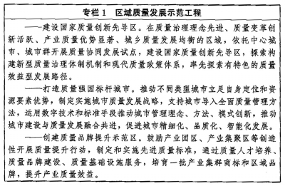 (九)打造区域质量发展新优势。加强质量政策引导,推动区域质量发展与生产力布局、区位优势、环境承载能力及社会发展需求对接融合。推动东部地区发挥质量变革创新的引领带动作用,增强质量竞争新优势,实现整体质量提升。引导中西部地区因地制宜发展特色产业,促进区域内支柱产业质量升级,培育形成质量发展比较优势。推动东北地区优化质量发展环境,加快新旧动能转换,促进产业改造升级和质量振兴。健全区域质量合作互助机制,推动区域质量协同发展。深化质量强省建设,推动质量强市、质量强业向纵深发展,打造质量强国建设标杆。(见专栏1)
