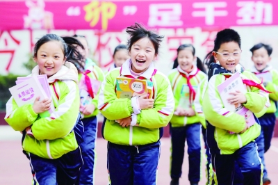 2月6日,安徽省淮北市第三实验小学,学生们领到新课本。