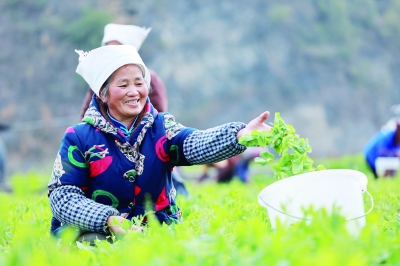 2月15日,在龙里县湾滩河镇郊外,菜农在采摘豌豆尖。近年来,贵州省龙里县因地制宜,大力发展豌豆尖种植,带动当地群众增收,助力乡村振兴。目前,龙里县豌豆尖种植面积3万余亩,产品直销到上海、广州、香港等地。 新华社记者 刘续/摄