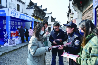 2月17日,浙江省东阳市公安局吴宁派出所和中国移动东阳分公司的反诈志愿者一起在卢宅老街上向游客和市民宣传反电信网络诈骗法。中新社发 包康轩/摄