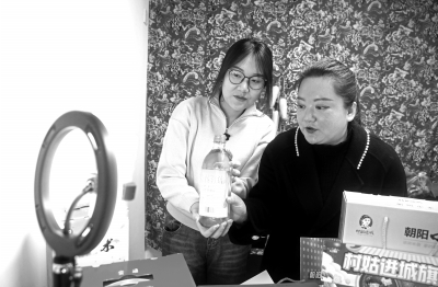 2月21日,在辽宁省朝阳市“村姑进城”实体店,王颖(右)和大学生一起直播卖货。王颖是辽宁省朝阳市朝阳县木头城子镇十家子村党支部书记。大学毕业后,她回到偏远的山村创业,借助网络电商推广家乡农产品,成为一名返乡新农人。王颖探索“互联网+种植基地+深加工+实体店”模式,解决农产品从生产源头到终端销售的问题。经过几年发展,王颖创办的公司带动村里固定员工和大学生40多人直接就业,农忙时100多人间接就业。新华社记者 杨青/摄