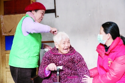 2月28日,在江西省南昌市青云谱区洪都街道洪西社区,家政服务人员李小珍为89岁的覃玉莲老人梳头,社区工作人员王素倩陪她聊天。    近年来,江西省南昌市青云谱区探索出“政府出资购买服务、社会组织提供服务、街道社区参与服务、民政部门监管服务”的居家养老服务模式,构建为老年人提供医疗护理、日间照料、助浴用餐、文体活动的15分钟养老服务圈,有效提升老年人的生活质量和幸福指数。    新华社记者 彭昭之/摄