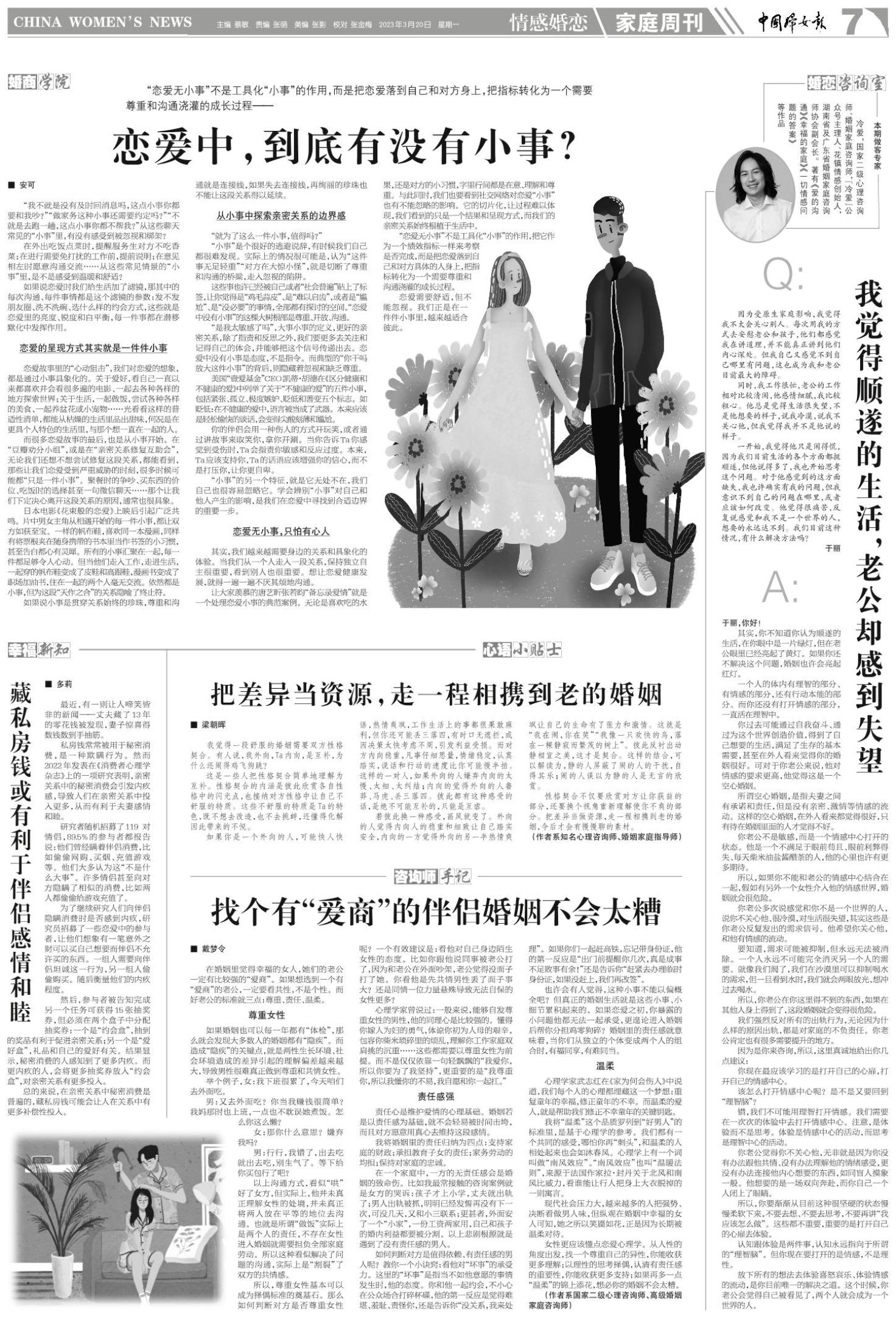 《中国妇女报》(电子版)的一切内容(包括但不限于文字、图片、PDF、图表、标志、标识、商标、版面设计、专栏目录与名称、内容分类标准以及为读者提供的任何信息)仅供中国妇女报读者阅读、学习研究使用,未经中国妇女报及/或相关权利人书面授权,任何单位及个人不得将《中国妇女报》(电子版)所登载、发布的内容用于商业性目的,包括但不限于转载、复制、发行、制作光盘、数据库、触摸展示等行为方式,或将之在非本站所属的服务器上作镜像。否则,中国妇女报将采取包括但不限于网上公示、向有关部门举报、诉讼等一切合法手段,追究侵权者的法律责任。