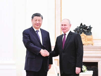 普京热烈欢迎习近平对俄罗斯进行国事访问,对习近平连任中国国家主席再次表示热烈祝贺。普京表示,过去十年来,中国各方面发展都取得令世人瞩目的伟大成就,这归功于习近平主席的卓越领导,也证明了中国国家制度和治理体系的优越。我坚信,在习近平主席坚强领导下,中国必将继续发展繁荣,顺利实现各项既定宏伟目标。在双方共同努力下,近年来俄中关系在各领域都取得了丰硕成果。俄方愿同中方继续深化双边务实合作,加强在国际事务中的沟通协作,推动世界多极化和国际关系民主化进程。