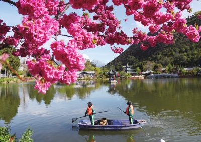 3月22日,在云南省丽江市古城区黑龙潭公园,环卫工人在打捞水面垃圾。