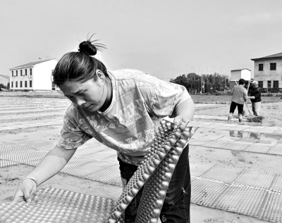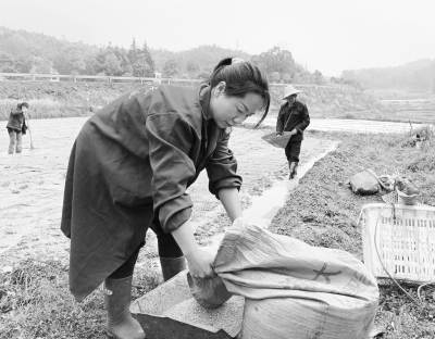 刚送完饭,贺丽姣又急着往回赶。她在莲盆嘴村承包了1280亩稻田,集中育秧面积有50亩。当天这边也请了帮工,一回来,她就赶紧下田给育秧拱棚盖地膜。