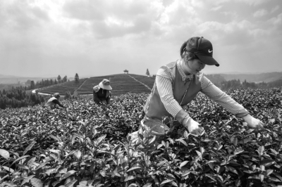 ▲ 3月15日,在贵州省黔东南州黎平县高屯镇侗家佬茶叶种植基地,采摘工正在采摘春茶。