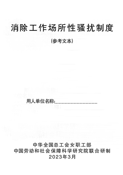 在今年“三八”国际劳动妇女节当天,人力资源和社会保障部、国家卫生健康委等六部门联合发布《消除工作场所性骚扰制度(参考文本)》和《工作场所女职工特殊劳动保护制度(参考文本)》,旨在加强用人单位内部规章制度规范指引,推动妇女权益保障法在工作场所落实落地落细。即日起,本刊摘录两份参考文本主要内容予以连载。