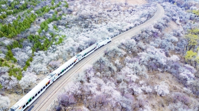 3月23日,一列S2线列车行驶在居庸关长城脚下花海中(无人机照片)。 近日,北京居庸关长城脚下山花渐次开放。北京市郊铁路S2线列车穿行于花海间,成为春日里一道美丽的风景。