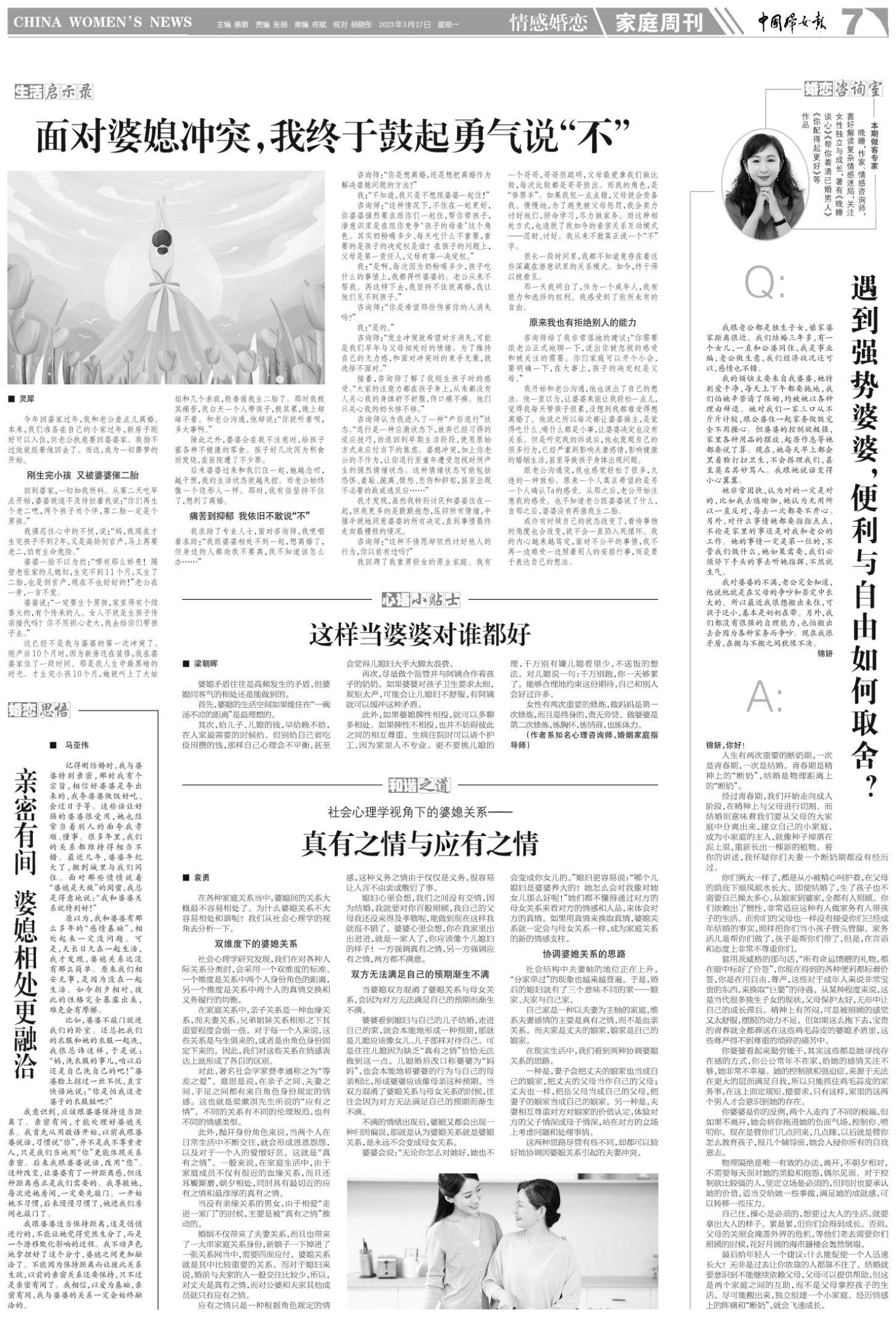 《中国妇女报》(电子版)的一切内容(包括但不限于文字、图片、PDF、图表、标志、标识、商标、版面设计、专栏目录与名称、内容分类标准以及为读者提供的任何信息)仅供中国妇女报读者阅读、学习研究使用,未经中国妇女报及/或相关权利人书面授权,任何单位及个人不得将《中国妇女报》(电子版)所登载、发布的内容用于商业性目的,包括但不限于转载、复制、发行、制作光盘、数据库、触摸展示等行为方式,或将之在非本站所属的服务器上作镜像。否则,中国妇女报将采取包括但不限于网上公示、向有关部门举报、诉讼等一切合法手段,追究侵权者的法律责任。