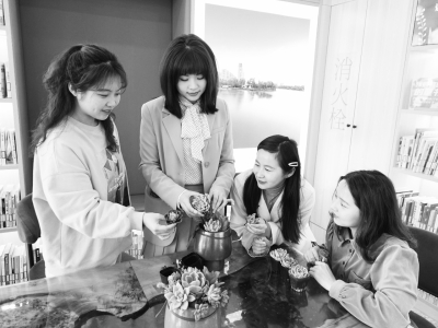 图为经开区塘汇街道青年女职工正在通过清根、垫底、填土、配色、栽种等环节,给多肉“安家”。