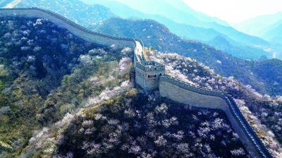 3月28日拍摄的水关长城(无人机照片)。 春日的京郊,山花遍野,与长城相映成景,引人入胜。 新华社记者