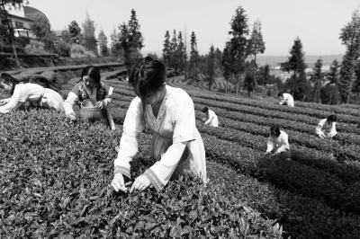 4月6日,汉服爱好者在青杠坪村茶园中体验采茶。 近日,四川省洪雅县止戈镇青杠坪村的村民们忙着在茶园里采摘茶叶鲜叶。近年来,青杠坪村立足万亩生态茶园资源禀赋,打造“青杠坪·茶客空间”农旅融合景区,为游客提供采茶体验、茶园研学、住宿餐饮等服务,经营两年来,景区累计接待游客总数39万人次。 新华社记者 江宏景/摄