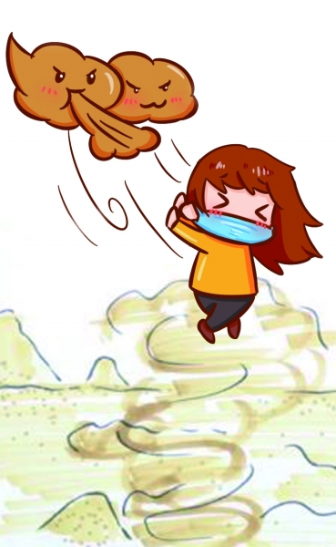 1.呼吸系统危害。通常情况下人的鼻腔对尘埃有一定的过滤作用,但沙尘天气可导致空气中PM10和PM2.5浓度升高。PM10吸入后,沉积在上呼吸道,通过纤毛运动,随着咳嗽、打喷嚏排出体外,这些颗粒物会对上呼吸道产生刺激,破坏呼吸系统防御功能,引起鼻塞、流涕、咽痛、咳嗽等上呼吸道症状。而PM2.5能够直接进入、附着在气管、支气管,甚至直达肺泡,诱发感染、炎症或者免疫反应,可导致支气管哮喘的发作。同时,小颗粒物中可吸附多种病原体(细菌、病毒等)、有害气体、重金属元素、有机污染物等有害物质,还可携带各种过敏原(杨絮、花粉等),当颗粒物进入呼吸道后,这些有害物质对呼吸道产生刺激和腐蚀作用,造成感染的同时还可激发过敏反应,诱发过敏性鼻炎、支气管哮喘等呼吸系统疾病。同时,沙尘天气会影响紫外线的辐射强度,降低紫外线的杀菌作用,空气中致病菌活性增强,增加呼吸道感染性疾病的发生。