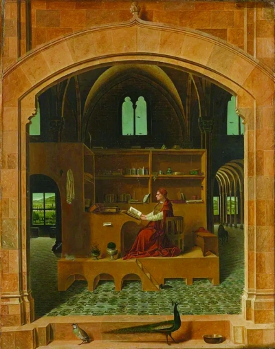 说到光影,给我印象最深的当数梅西耶的《书房中的圣哲罗姆》,中世纪的画面渗透着后现代的意味,画面似乎是立体的,光影透过书房门口的孔雀照射进来,打在书桌上端坐的她的身上,再穿过后窗,抵达远方的田野。
