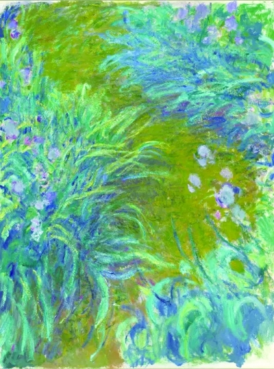 莫奈依然延续了他的作品大尺幅的特点,难得的是这次展出的不是睡莲,而是鸢尾花。不禁让人联想起阿尔炽热的太阳,以及梵高笔下金色的向日葵和大片的鸢尾。事实上,这幅《鸢尾花》和梵高的《长草地与蝴蝶》,在构图和色彩搭配上,颇有点神似。