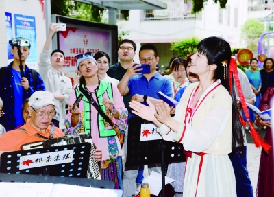 全媒体采访团成员与福安市阳春社区居民即兴互动歌唱《我和我的祖国》。