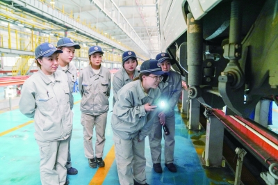 在哈尔滨动车段整备库,“雪绒花”女子班组部分成员在进行业务交流(4月20日摄)。 哈尔滨动车段“雪绒花”女子班组成立于2022年4月,由23名女孩组成,主要负责动车组的检查维修工作。在距地面5米高的动车组车体顶部,除了安全绳,没有任何可以保持身体稳定的设施,只有经过不断训练,才可以进行常规作业。在车顶设备中,一根碳滑板有20斤重,机械师需要在二十分钟时间内完成拆装更换,从而保证电流从接触网引入动车组电气系统。随着“五一”小长假临近,以及春季整修期冬夏换季的零部件检查更换,动车组上线率逐步增多,检修时限缩短,一组动车组平均检修时间为两个半小时,每名女机械师每天至少要检修两组动车组。新华社记者 王松/摄