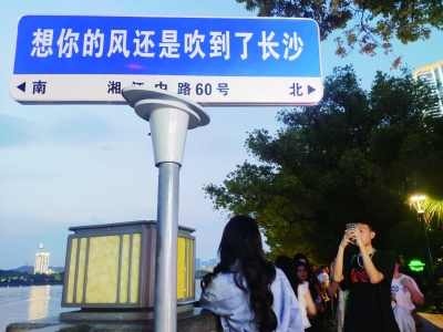 “我在长沙想念你”“想你的风还是吹到了长沙”,位于湘江中路的这两块网红路牌前,成了新网红打卡点,吸引着众多游客慕名而来,在湘江边拍照留念。网友直呼:“长沙真是个浪漫的地方”“姐妹们快来拍照打卡”。