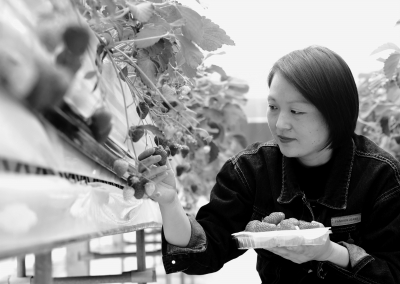 5月7日,游客在江苏省扬州市江都区现代农业产业园大棚内采摘草莓。 近年来,江苏省扬州市江都区实施“绿色农业+观光旅游”生态发展模式,以绿色农业发展拉动旅游观光,以旅游观光促进绿色农业发展、助力乡村振兴。 新华社发(辛一/摄)