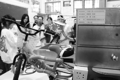 日前,湖南省隆回县岩口镇藕塘小学师生发明的三力(磁力、重力、吸力)型垃圾回收环保车受到参观者的称赞。
