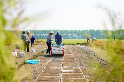 5月14日,江苏省南京市六合区钱仓村的农民在田间使用机械设备进行水稻育秧。