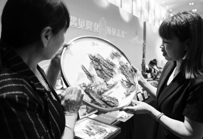 5月16日,人们欣赏展出的树皮画。 当日,“遇见隆化 预见未来”河北隆化招商推介会在北京举行。隆化县就农业、文旅、工业等特色优势产业进行推介,当地民间艺人在推介会上展示技艺。新华社记者 金良快/摄