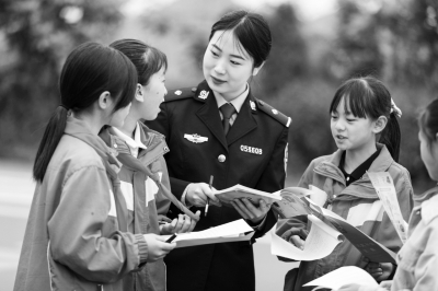 5月22日,女民警在贵州省黔西市雨朵镇龙场小学给小学生讲解禁毒知识。当日,黔西市公安局民警来到龙场小学,用通俗易懂的语言和真实的案例,给小学生讲解民法典、道路交通安全法、禁毒法和预防电信诈骗、防校园欺凌等法律法规知识,增强他们的防范意识和自我保护能力。 (中国妇女报全媒体记者高峰/文 周训超/摄)