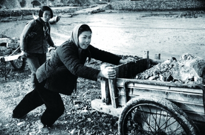运石头也是苦活儿,当年没有汽车、拖拉机,全靠小板车拉。她们两人一组,百把斤重的大石头要抬上车,七八百斤沙子要拉着跑,要是脚力差点儿的根本撑不住。李赛成回忆说,当时基干女民兵组建突击队,搞劳动竞赛,一个妇女每天要拉60车石头,你追我赶,像蚂蚁搬骨头似的,一车接一车,劳动场面十分壮观。