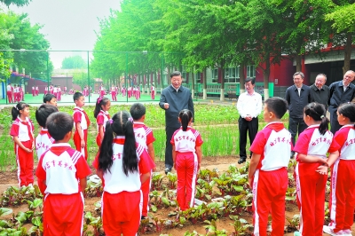 随后,习近平来到学生农场。这里是学生开展农业种植活动的实践场所,阳光下、田垄上,一排排绿油油的菜苗生机勃勃。孩子们拿着水桶、铲子、耙子、毛笔,为西红柿、黄瓜等浇水、松土、除草、授粉。习近平强调,很多知识和道理都来自劳动、来自生活。引导孩子们从小树立劳动观念,培养劳动习惯,提高劳动能力,有利于他们更好地学习知识。现在一些城里的孩子接触农村、接触大自然少,不光“四体不勤”,而且“五谷不分”,对吃的是什么、从哪里来的、怎么来的都不知道,更体会不到“谁知盘中餐,粒粒皆辛苦”。他对同学们说,认识大自然,首先要从认识身边的植物开始。同学们栽培的各种植物,虽然书本上都有介绍,但大家亲手种、亲自培育、跟踪观察,收获肯定是不一样的。希望同学们从“学农”中感受到农作的艰辛和农民的不易,从小养成热爱劳动、珍爱粮食、尊重自然的良好习惯,为建设美丽中国作贡献。新时代生态文明建设要从娃娃抓起,通过生动活泼的劳动体验课程,让孩子亲自动手、亲身体验、自我感悟,让“绿水青山就是金山银山”的理念早早植入孩子的心灵。