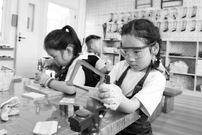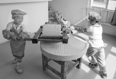 在江苏省海安高新区实验幼儿园,小朋友在学习木工、体验推磨。向中林/摄