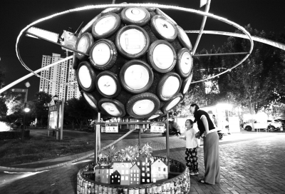 6月3日,在山东省滕州市市民广场,市民观看利用废旧电动车外胎和易拉罐、一次性筷子等废弃物制作的“生态地球”模型。连日来,各地通过多种形式的活动迎接6月5日世界环境日的到来。 新华社发(李志军/摄)