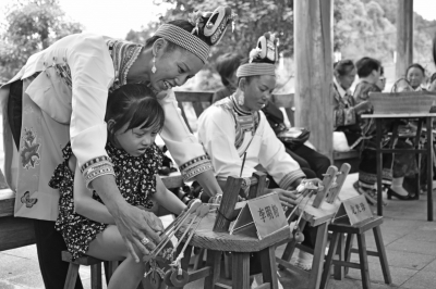 6月10日,在贵州省麻江县马鞍山生态体育公园,苗族艺人在向小朋友讲授苗族打花带技艺。近年来,麻江县依托独具民族特色的非物质文化遗产手工技艺,通过开设非遗创意工坊、非遗体验馆、绣娘工坊以及举办赛事展示活动、开办培训班等措施,“传、帮、带”加大对非遗人才、手工艺人的培育和非物质文化遗产保护、传承,并积极引导发展苗族刺绣、织锦、枫香印染等“指尖经济”。目前,该县有千余名妇女从事非遗手工技艺产业,在家门口实现顾家、传艺、增收“三不误”。
