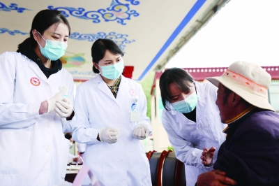 6月13日,医疗专家组在拉萨为市民做检查。 当日,来自北京、上海、西安的10余名医学专家来到拉萨,就当地市民存在的多发病、常见病等提供现场诊治和用药知识讲解,开展健康检查义诊服务,同时为西藏自治区相关医院和基层医疗卫生机构捐赠医疗设备与保健产品。 新华社记者 卢烨/摄