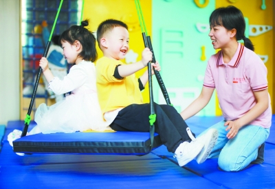 6月13日,贵州省黔西市莲城街道莲城社区托育中心,孩子们在老师的带领下荡秋千。2019年以来,黔西市不断落实生育政策和人口工作,在人口密集的社区开办“早教托育班”,同时定期举办早教家长辅导班,助力家长科学育儿。