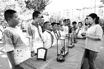 图为省级非遗项目“阳泉彩色面塑”传承人、工艺美术大师付海云老师(右一)为孩子们讲解面塑技艺。