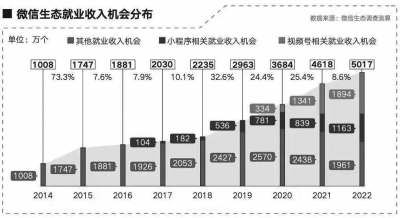 从就业总量来看,《报告》发现,由微信公众号、小程序、视频号、微信支付、企业微信等构成的数字生态,在2022年的就业收入机会达到5017.3万个(包括正规就业、创业、自营劳动以及其他灵活就业,也包括通过兼职活动或短暂劳动取酬),较上年增长8.6%。其中视频号衍生的就业收入机会达到1894万个,同比增长41.2%;小程序衍生的就业收入机会达到1163万个,同比增长38.5%。从就业群体分析,数字生态正成为青年就业创业的重要方向。《报告》的相关数据显示,在微信数字生态的从业人员中,35岁以下青年人的就业比例较高,总体在56.8%左右,其中小程序开发者中青年占比达到73.4%。进入微信生态就业的青年人员既有以往已经就业创业的人员,也有在校生群体,还有失业人员、农民等。